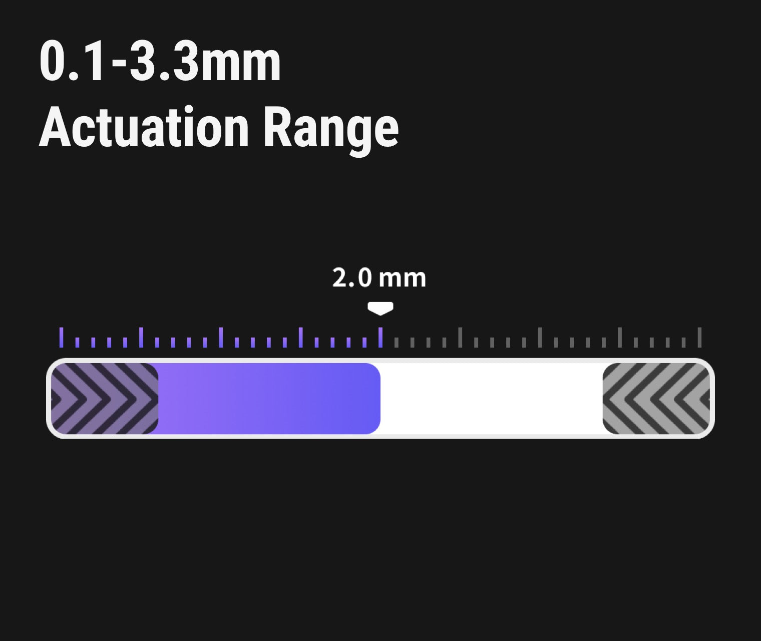 Air60 HE は世界最速のキーボードであると主張していますが、これには最速のアクチュエーションと最速のレスポンスという 2 つの側面があります。磁気スイッチにより、アクチュエーション ポイントを 0.1mm から 3.3mm まで調整でき、0.1mm ではトリガー距離が最短になります。新しい高度な MCU により、真の 8000Hz ポーリング レートが保証され、レイテンシが驚異の 0.1ms に短縮され、既知のすべてのゲーミング キーボードを上回ります。