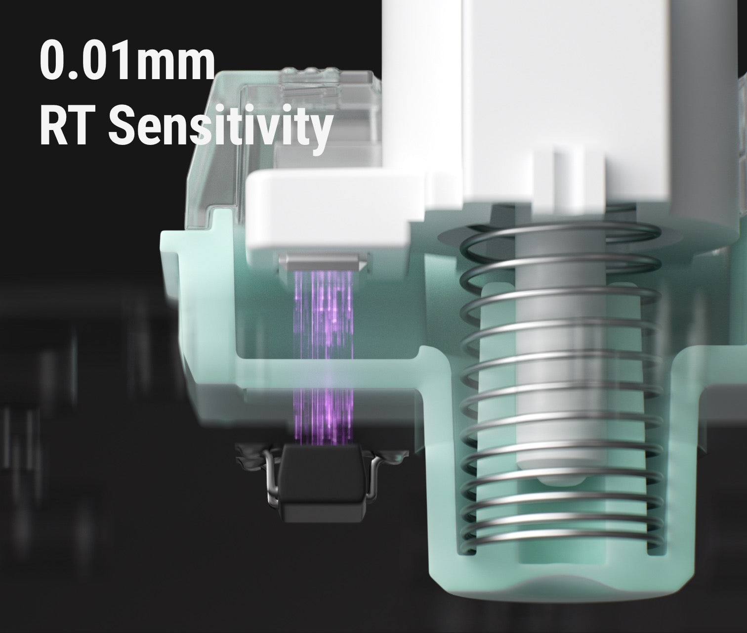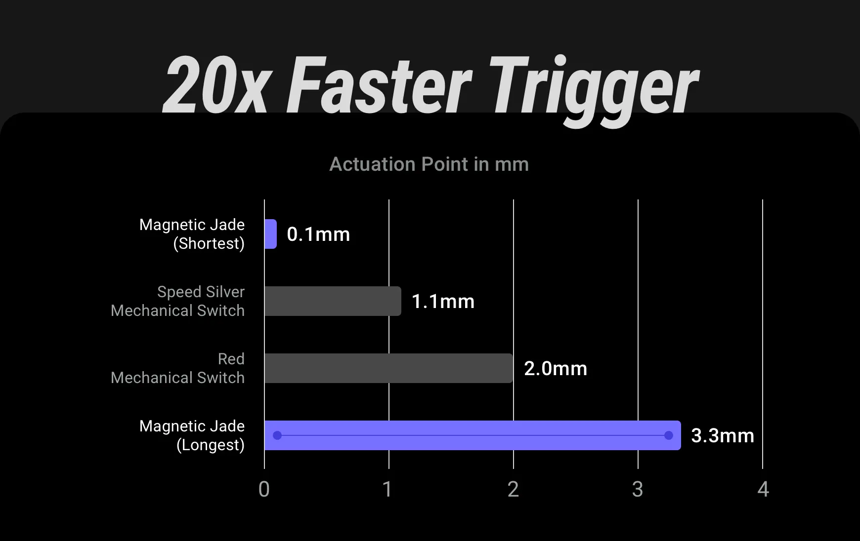 磁気スイッチはデバウンス遅延をなくし、作動距離を 2.0mm (レッド メカニカル スイッチ) および 1.1mm (シルバー メカニカル スイッチ) からわずか 0.1mm に短縮します。金属接点がないため、よりスムーズなパフォーマンスを実現し、従来のメカニカル スイッチよりも 50% ~ 100% 長持ちします。