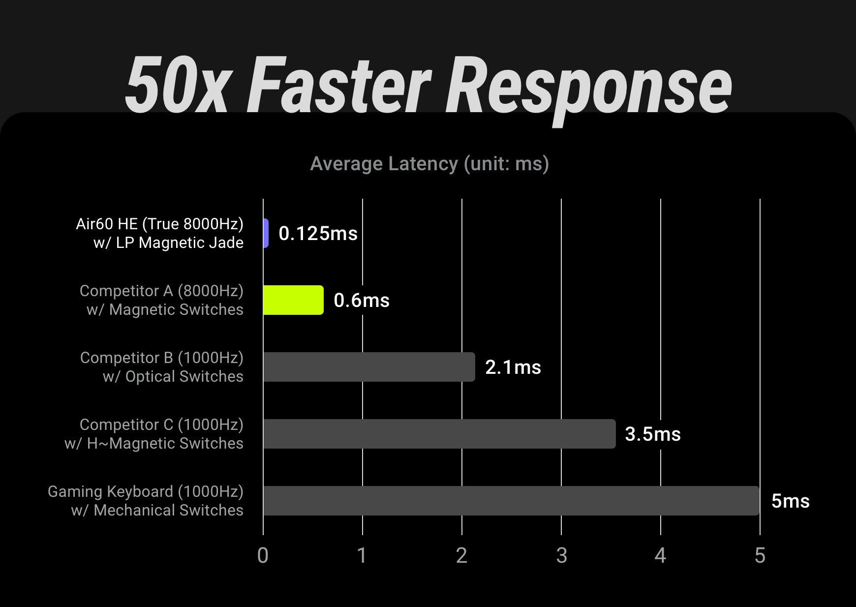 Air60HE は、8000Hz ポーリング レートと 8000Hz PCB スキャン レートの両方を備えた世界初の薄型キーボードです。そのレイテンシーは、ほとんどの 8000Hz 磁気スイッチ キーボードよりも大幅に低く、従来のゲーミング キーボードよりも 50 倍高速な応答速度を実現します。この画期的なパフォーマンスは、レイテンシーの新たなベンチマークを確立します。