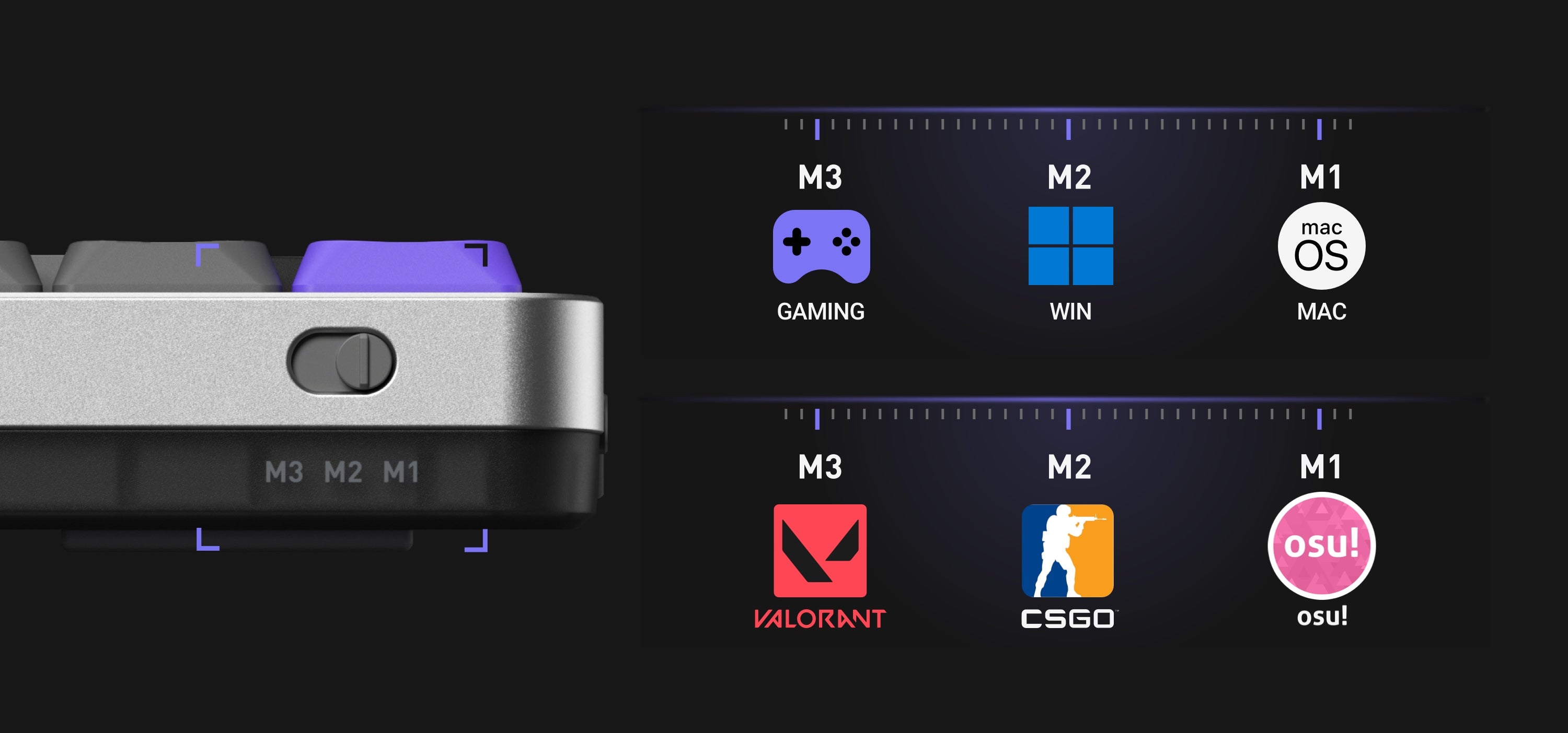 以前の NuPhy キーボードのモードを完全に見直し、レイヤー、照明、移動距離、感度など、ユーザー ロールに関連付けられたすべてのデータの統合と整理を実現しました。異なる OS や異なるゲームごとに異なるモードを用意でき、再設計された RapidSwitch ですべて選択できます。超人的な APM を手に入れるために、スーパーヒーローのような努力をする必要はもうありません。