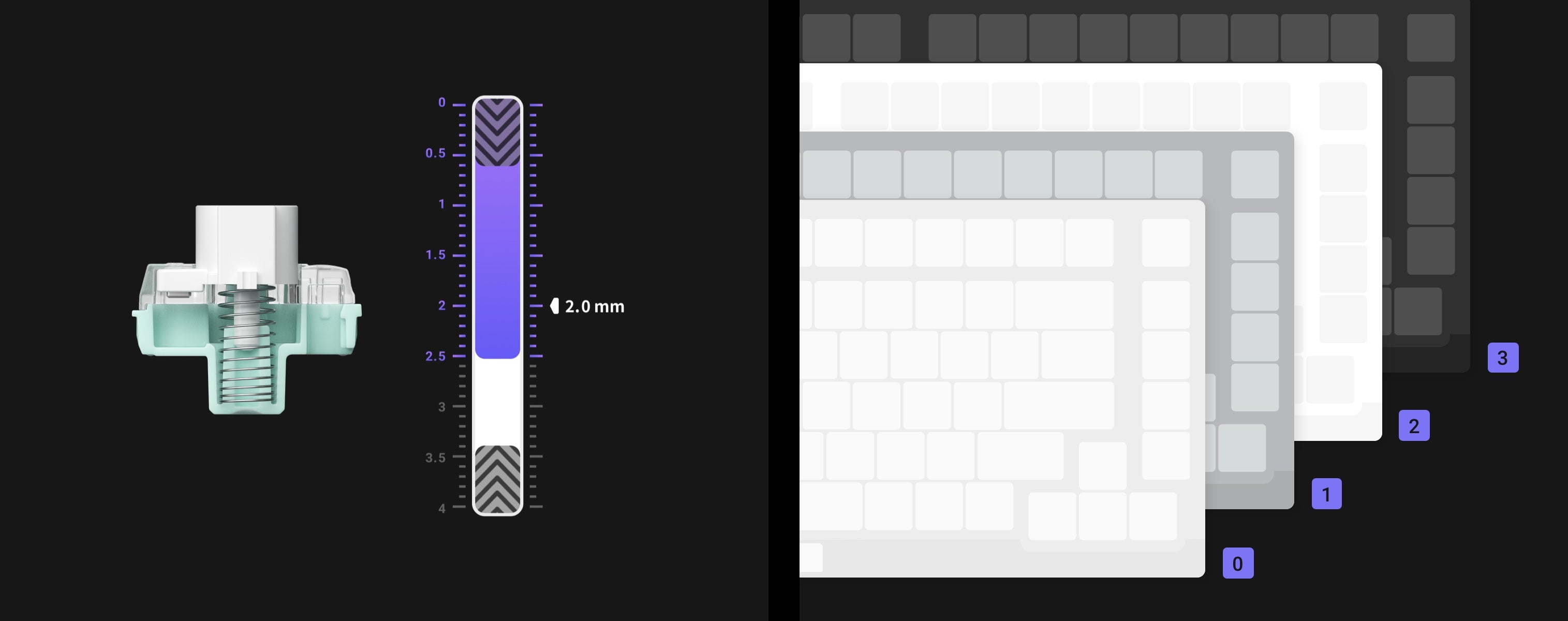 デッドゾーンや解像度といった難解な技術的概念が、視覚化されアニメーションで設定可能になりました。これらをリアルタイムで調整し、指と目で違いを体感できるようになっています。他にも多くのパラメータが同様に操作可能です。また、レイヤーも同様に視覚的に操作でき、モダンなキーボードコンフィギュレーターでのレイアウト編集ができます。また、最大12レイヤーがサポートされ、各モードに4つのレイヤーを設定可能です。