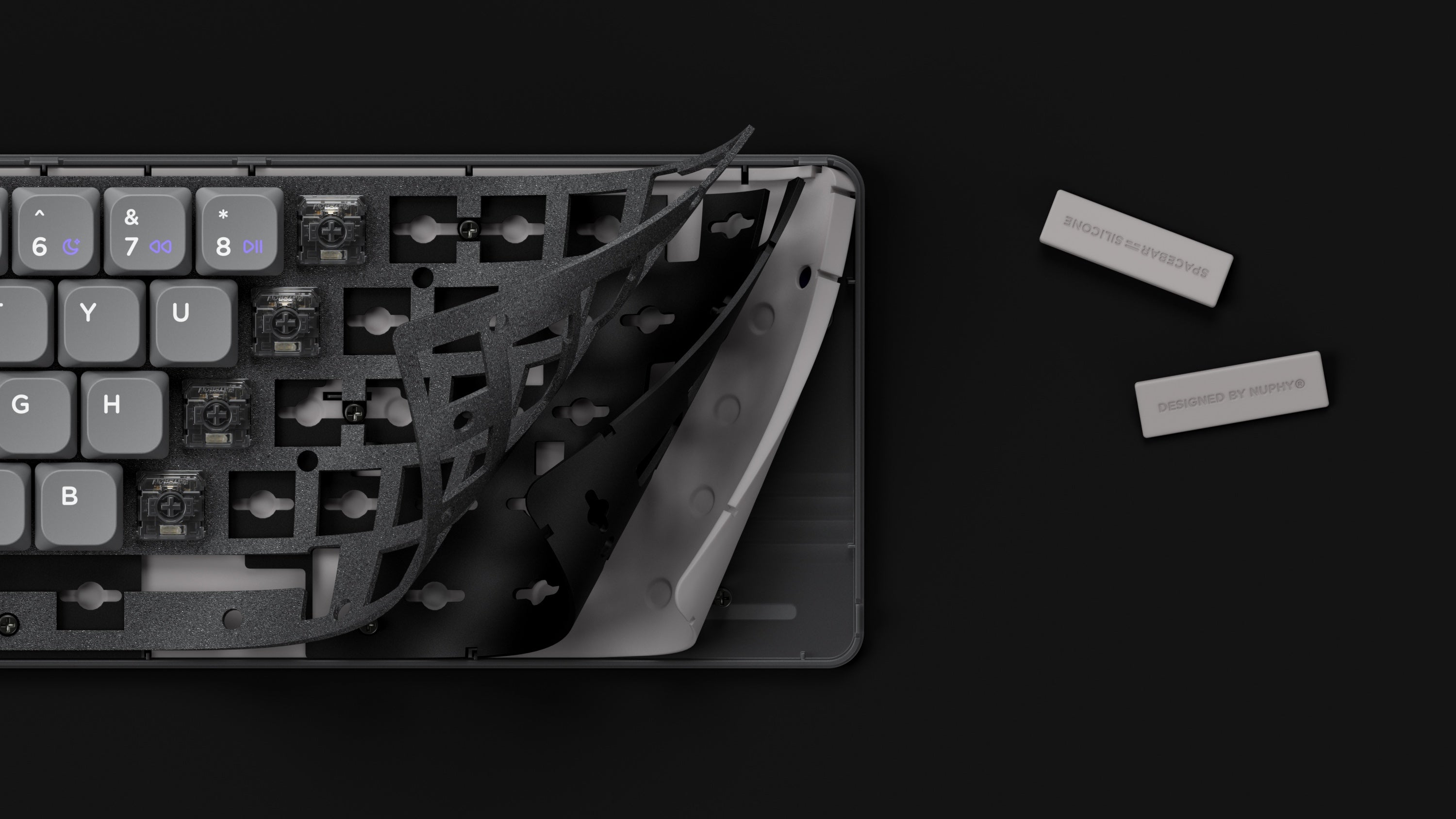 磁気スイッチ用の最初の薄型キーボードを設計するために、移動精度を優先し、ガスケットマウント、PC/POM プレート、サウンドダンパー、スイッチパッドなどの一般的な構造要素をいくつか除外しました。オプションが大幅に絞り込まれたため、PCB フォーム、プレートフォーム、底部シリコンを組み込んで、きれいなタイピング音を実現しました。
