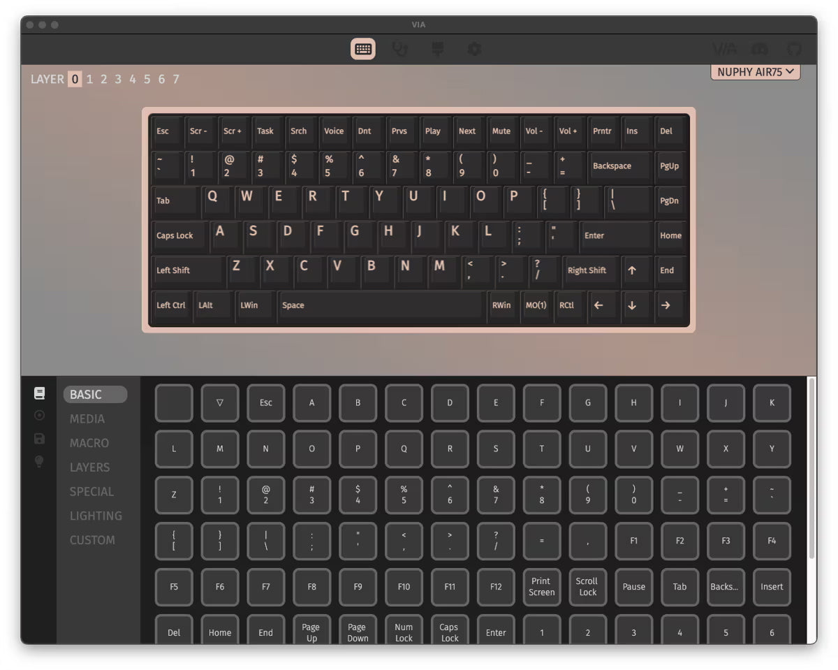 VIAのキーマップ設キーマップ設定とマクロ機能は主要なデスクトッププラットフォームはもちろん、ブラウザ対応の環境でもシームレスに動作します。これにより、Air75を思いのままにカスタマイズするのがこれまで以上に簡単になりました。