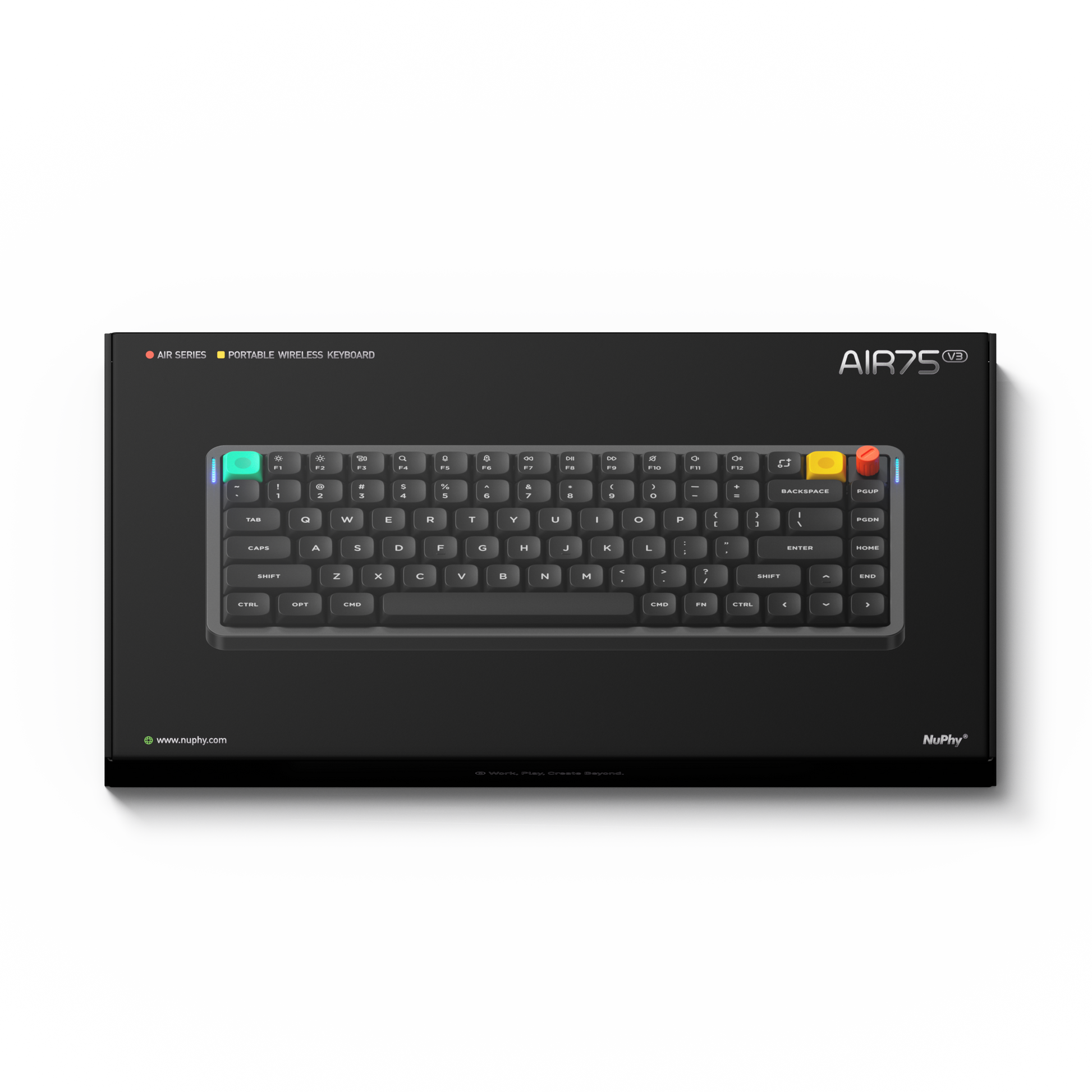 世界で最も愛されているロープロファイルキーボード:Air75がさらに薄型でパワフルとなり、Air75 V3として進化を遂げて帰ってきました。搭載されたNuPhyの新世代Nanoスイッチ※はキーストロークがノーマルプロファイル並みに深く、そしてバッテリー持続時間も大幅に向上しました。新たなカラーバリエーション、更に多様なライトエフェクト、そしてよりカラフルな光の演出が追加されました。また、押すより回す操作が必要なときに活躍する新しいロータリーノブも搭載しました。