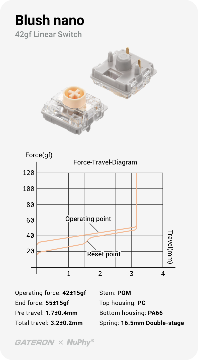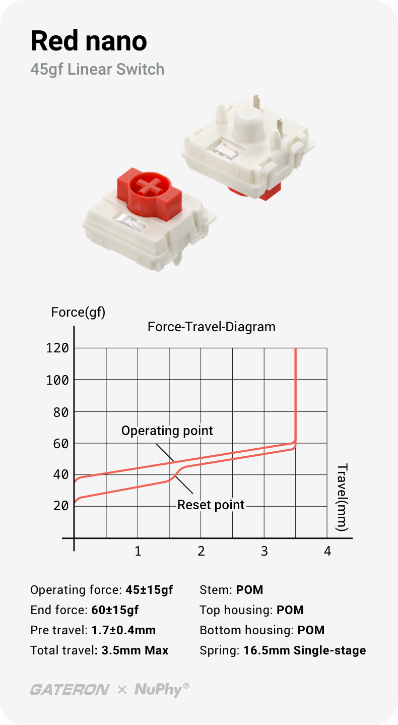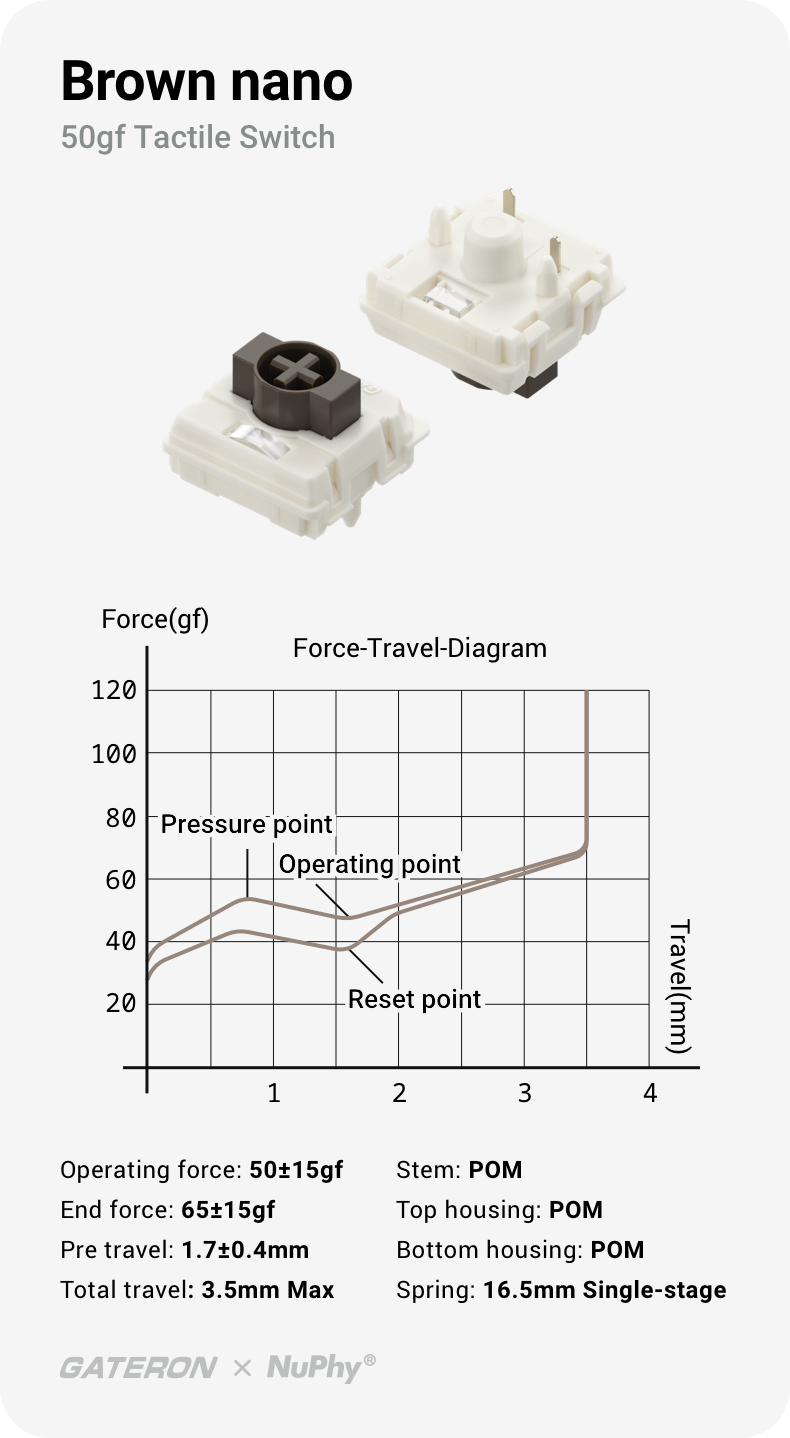 3.5mmのキーストロークを誇るNanoスイッチは、メカニカルスイッチのタイピング体験の領域をさらに広げていきます。クリーミーな打鍵音、やさしくもしっかりとした押し心地、深いストローク、そしてロープロファイルならではの快適な人間工学設計——これらが絶妙に調和し、生産性の向上だけでなく、作業の満足感ももたらしてくれます。