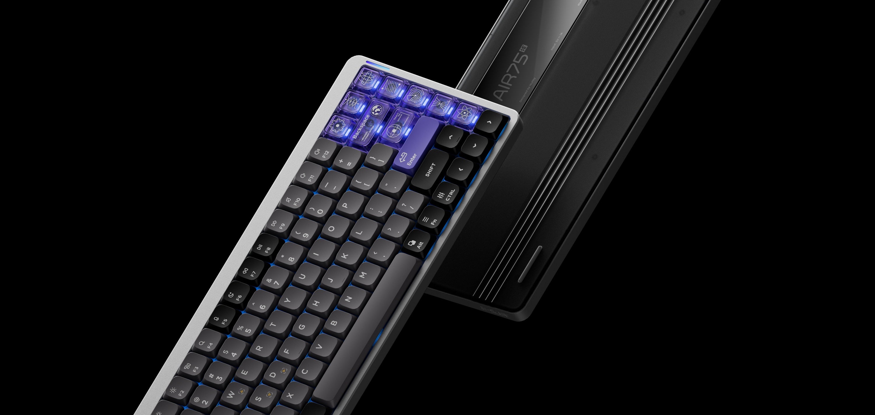Air75 HEはAirシリーズのミニマリストスタイルを引き継ぎ、アイコニックなサイドライトと薄型軽量のボディが特徴的です。一体型のアルミフレームにより、頑丈さと耐久性が保証されています。また、Air75 HEのために全く新しいテーマのキーキャップをデザインしました。透明なキーキャップを採用することにより、これまでにない楽しいゲーム体験をお届けします。