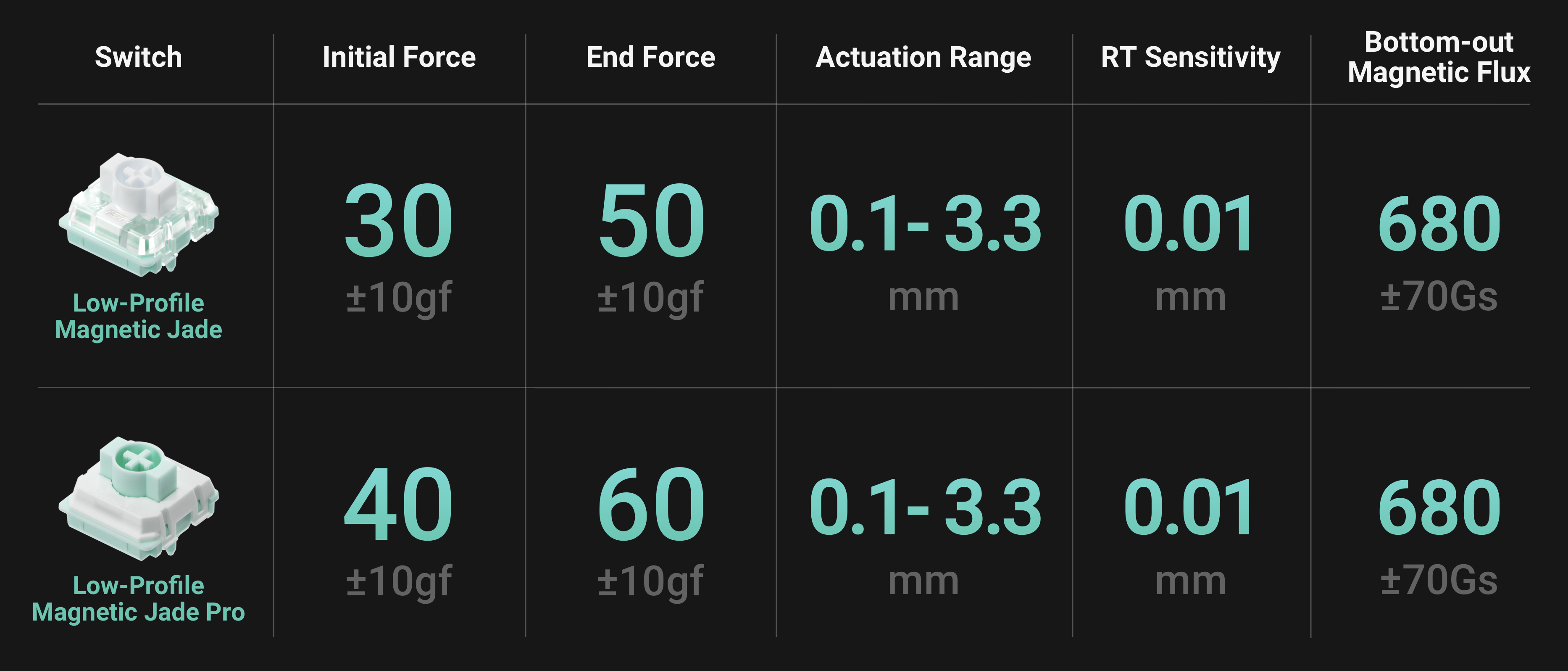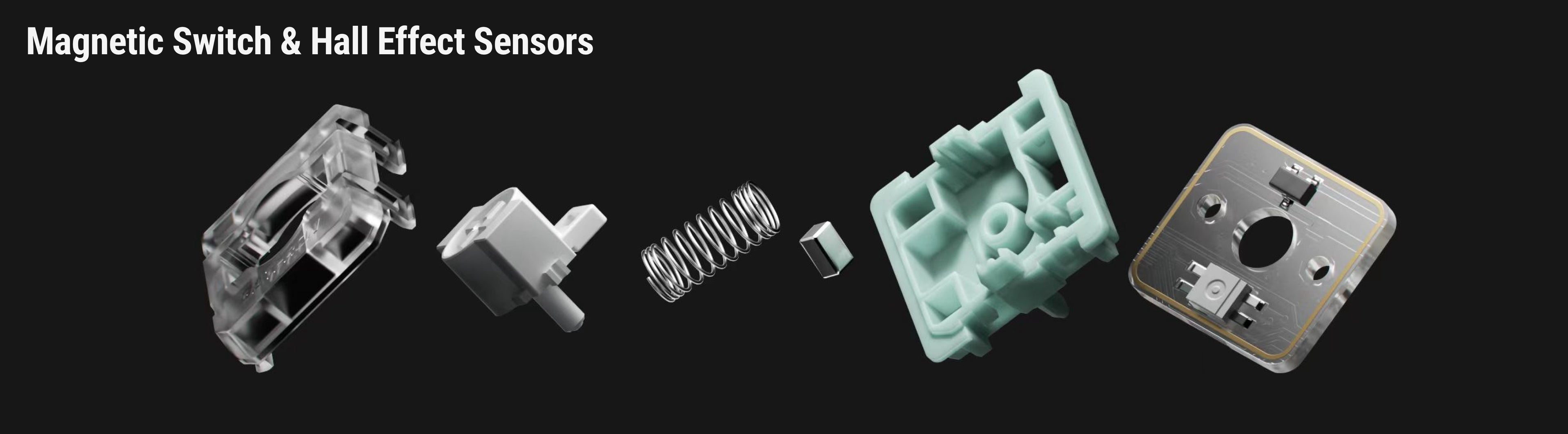 磁気スイッチはデバウンス遅延をなくし、作動距離を2.0mm (一般的な赤軸 メカニカル スイッチ) および 1.1mm (一般的な銀軸 メカニカル スイッチ) からわずか0.1mmに短縮します。金属接点がないため、よりスムーズなパフォーマンスを実現し、従来のメカニカルスイッチよりも 50% ~ 100% 長持ちします。