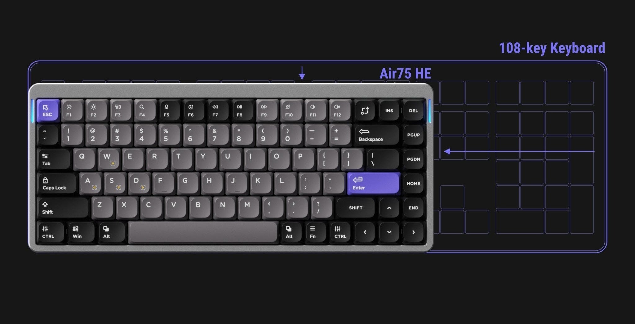 磁気スイッチは新たなスタンダードであり、Gateron Magnetic Jade スイッチはまさにその真なるベンチマークです。Air75 HEの設計当初から、私たちは Gateron と協力することにより、Magnetic Jade スイッチの比類なき感触、パフォーマンス、安定性、タイピングサウンドを実現することを目指しました。この目標は、見事に達成されました。