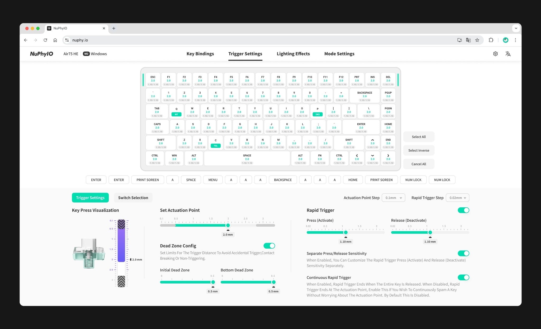 従来の NuPhyキーボードに搭載されていたモードを一新し、レイヤー、照明、移動距離、感度など、ユーザーロールに関連付けられたすべてのデータを統合し、OSやゲームごとに異なるモードを持つことができ、それらはすべて再設計されたRapidSwitchで選択することができます。超人的な APM を手に入れるために、スーパーヒーローのような努力をする必要はもうありません。