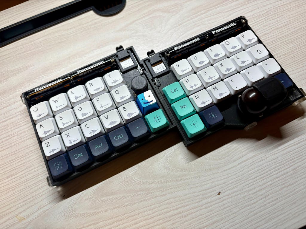 NuPhyとSudaの共同プロジェクトであるこのCymaticsキーキャップセットは、キーの視覚および音響的な側面の関係の構成に着目した実験的なデザインです。デザインのハイライトは、5つのチャルディ柄にインスパイアされたキーの刻印と、Jessica Normile氏の「Sound Wave Alphabet」に着想を得た波形の文字表現です。これらの波形は、それぞれ対応する文字の音を表しており、キーの刻印の下に配置されています。個別に録音された波形は、文字のフォントに合わせてさらにピクセル化されています。全体のカラーテーマとしては、SFの雰囲気を醸し出すインディゴ+ターコイズ+ホワイトの組み合わせを採用しました。カラーレイアウトに関しては、従来の「白内」レイアウトの逆を選択しました。これにより、視覚的なインパクトが強化されるだけでなく、このキーキャップセットの最も重要な波形が際立つようになっています。