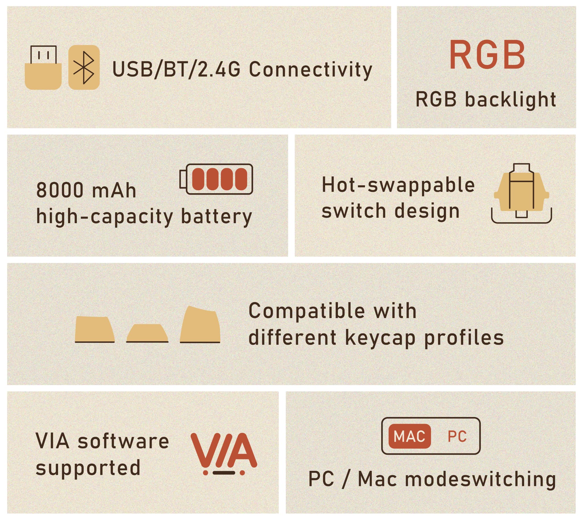 - トライモード接続対応:USB有線接続、Bluetooth、2.4GHzワイヤレスのトライモード接続に対応。使用シーンに応じて柔軟に接続方式を切り替えられます。