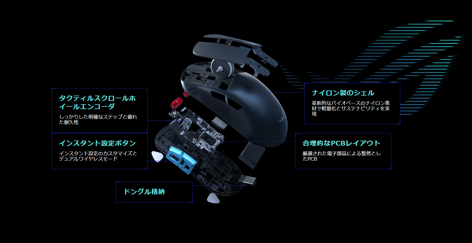 オンボードカスタマイズにより、DPIやポーリングレート、リフトオフディスタンスの調整やキャリブレーション、ハードウェアのリセットなど、どこでもすぐに設定できます。ROG Harpe Aceは接続するだけですぐに使用できるため、eスポーツのトーナメントシーンにも適しています。