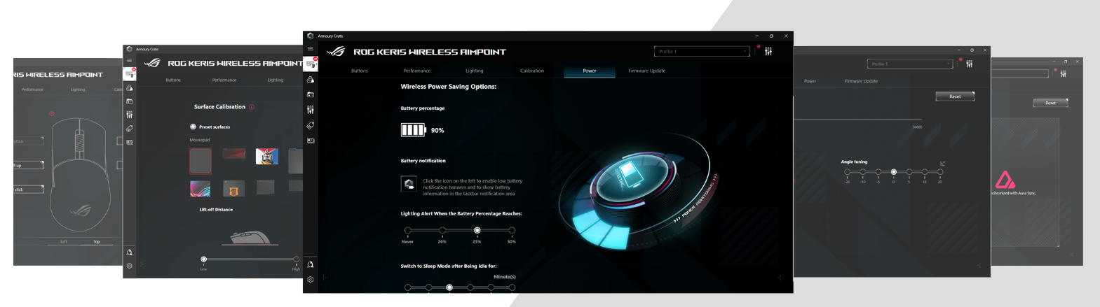 専用ソフトウェア;Armoury Crateでプレイスタイルに合わせた各種設定を簡単に調整できます。パフォーマンスやサーフェスキャリブレーションの設定、ボタン機能の割り当て、ライトエフェクトのカスタマイズに対応しています。さらに、ゲーム中のハードウェア情報を確認し、データ分析に活用することも可能です。