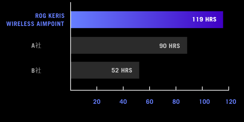 バッテリー寿命:約119時間(RGBライトエフェクトオフ時)、86時間(ライトエフェクトを「Breathing」に設定時)