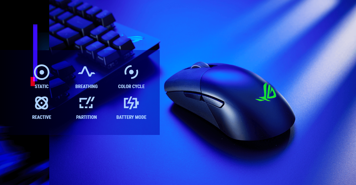 ・ROG AimPoint光学センサー搭載:36,000dpi・650ips・50gの加速度・最大1,000Hzポーリングレートに対応し、高精度かつ低遅延な操作が可能