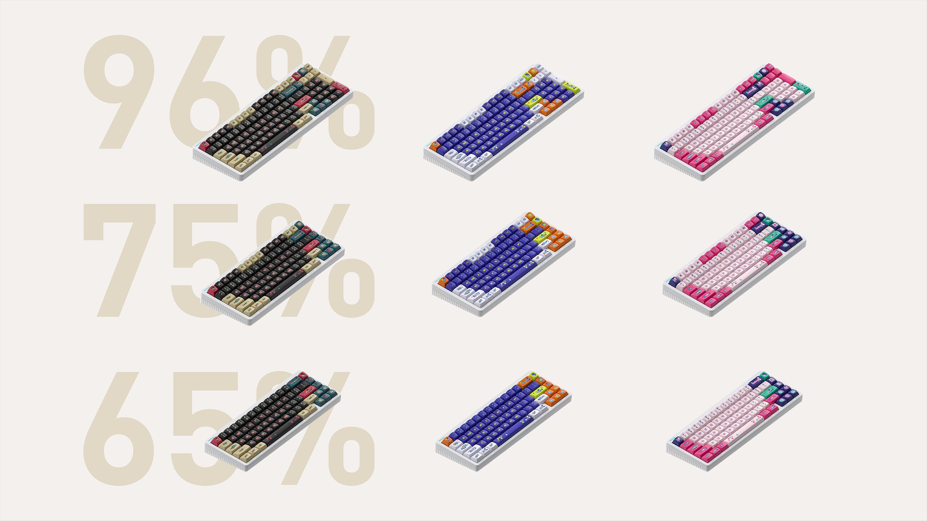 KDA Y2Kキーキャップは合計171キーを含み、NuPhy Halo65、Halo75、Halo96、Gem80、Field75に対応しています。また、以下のレイアウトのほとんどのコンパクトメカニカルキーボードと互換可能です:60 / 61 / 64 / 65 / 67 / 68 / 75 / 84 / 87 / 96 / 98 / 100 / 104 / 108 / Alice / ISO。