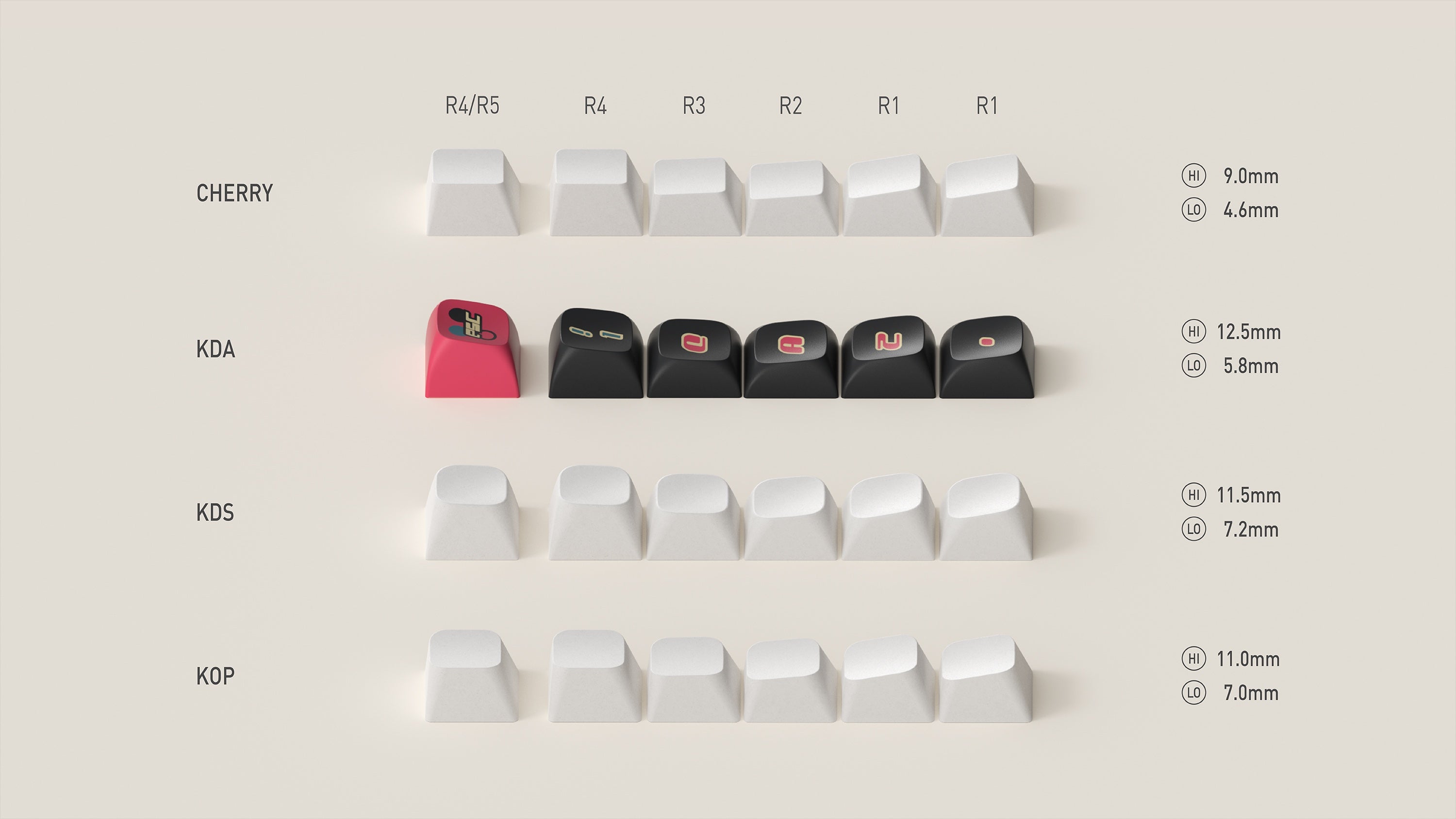 KeyTokが開発したKDAプロファイルには、1列目から5列目までの高さが個別に調整されています。人間工学に基づいて設計されたこのプロファイルは、より良いタイピング体験と高いタイピング効率を実現します。KDAの丸みを帯びた角は、シャープな角の視覚的な不快感を取り除き、より合理的な外観に変えています。また、表面のカーブは指との密着性を維持するのに役立ち、タッチに滑らかさと快適さをもたらします。